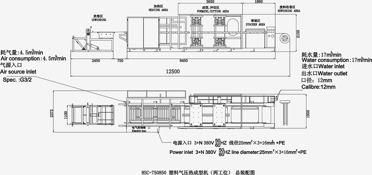 HSC-750850 型高效程控塑料氣壓熱成型機,運用國際最新塑料片材成型工藝技術,是集機、電、氣一體化設計,采用微電腦及可編程控制器 (PLC) 控制,人機界面操作,隧道式曲面漫輻射加熱,凹凸模皆可成型,激光刀片沖切,加熱、成型、沖切、堆垛分四工位,同時運行等先進技術。即送片、加熱、成型、切邊、堆垛一次完成的塑料片材成型設備。